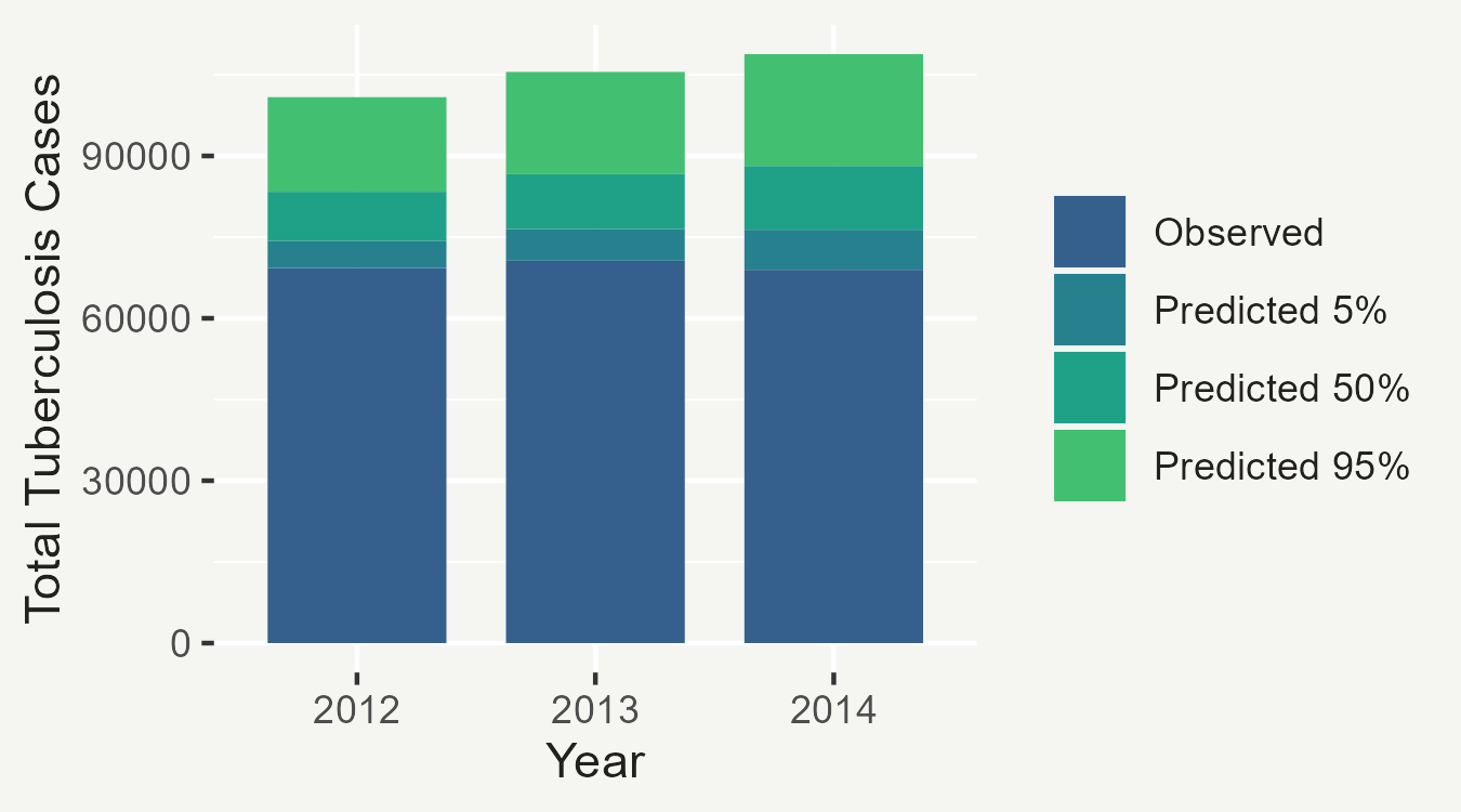 Here the observed counts are shown along with the 5%, 50%, and 95% quantiles for the predicted unreported cases.